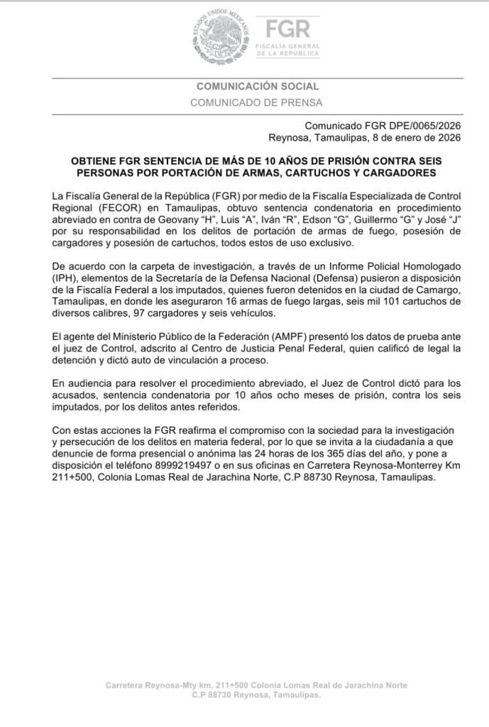 La Fiscalía General de la República (FGR) por medio de la Fiscalía Especializada de Control Regional (FECOR) en Tamaulipas, obtuvo sentencia de más de 10 años de prisión contra seis personas por portación de armas, cartuchos y cargadores.