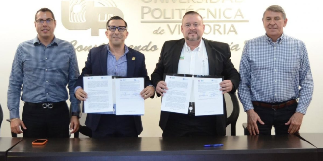 Ciudad Victoria, Tamaulipas.– La Universidad Politécnica de Victoria (UPV) firmó un convenio de colaboración con la Cámara Nacional de Comercio en la capital (CANACO Victoria), con la idea de fortalecer el emprendimiento y la vinculación entre el sector académico y el empresarial.