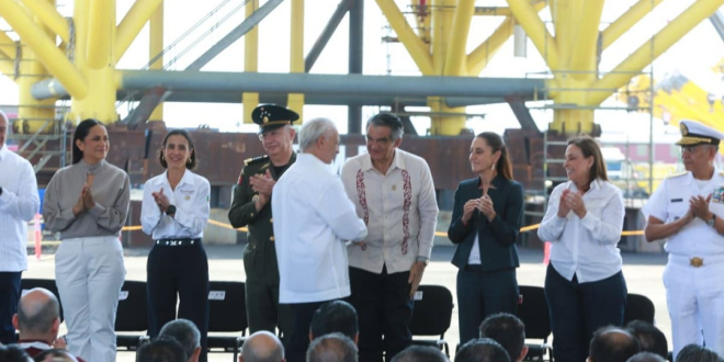 Durante el evento celebrado en el Patio Industrial de Pueblo Viejo, Veracruz, y junto a la gobernadora anfitriona Rocío Nahle García, al pie de las nuevas plataformas petroleras marinas construidas por Petróleos Mexicanos, la presidenta Claudia Sheinbaum destacó la presencia de Américo Villarreal, a quien consideró «un hombre nacionalista y visionario».